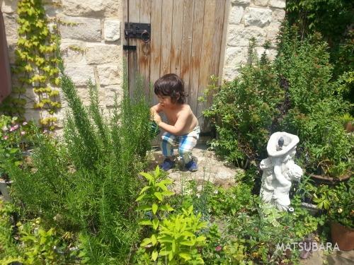 夏のある日、コッツウォルズ小屋の前で無心に水やりをしている幼な子は13年前の我が息子です!