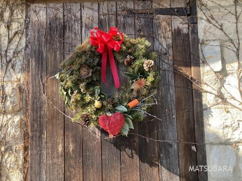 毎年桜ケ丘園芸さんが届けてくださるクリスマスリースをコッツウォルズ小屋の扉に飾って。11月終わり頃は秋とクリスマスが入り混じるいつもの光景。